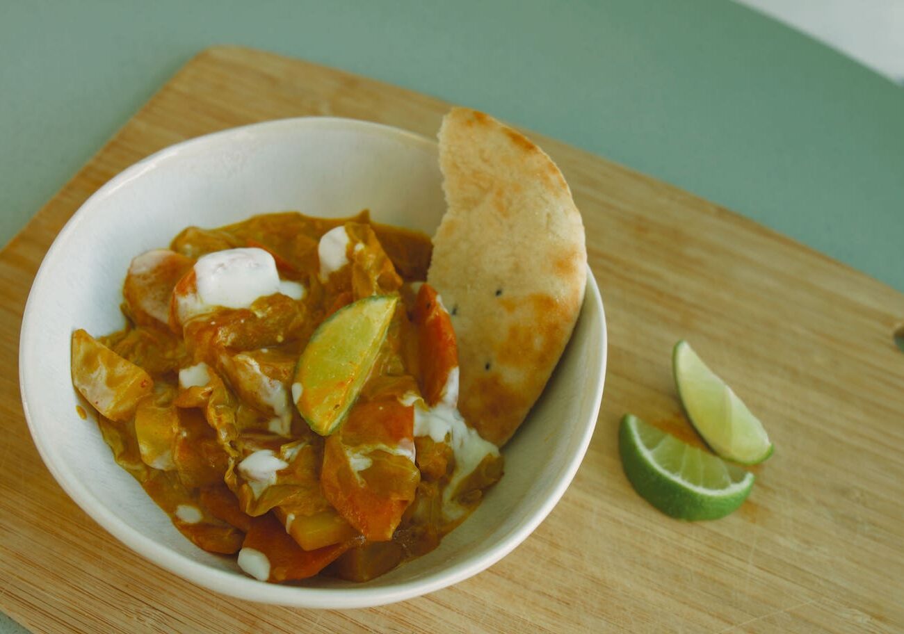 Mit Gemüsebrühe und Kokosmilch ablöschen und Curry Paste dazu geben. 5 Min. köcheln lassen, dann den Spitzkohl zum Curry hinzugeben und abgedeckt weitere 10 – 12 Min. kochen lassen bis das Gemüse weich ist. Dann nach Geschmack würzen, zB. mit Sojasoße, Ingwer-Pulver, Kurkuma oder Chili. Inzwischen die Limette waschen, in Spalten schneiden und etwas Limettensaft zum Curry hinzufügen. Dann gerne noch mit Chiliflocken und/oder weiteren Limettenspalten garnieren. Dazu essen wir am liebsten Fladenbrot.